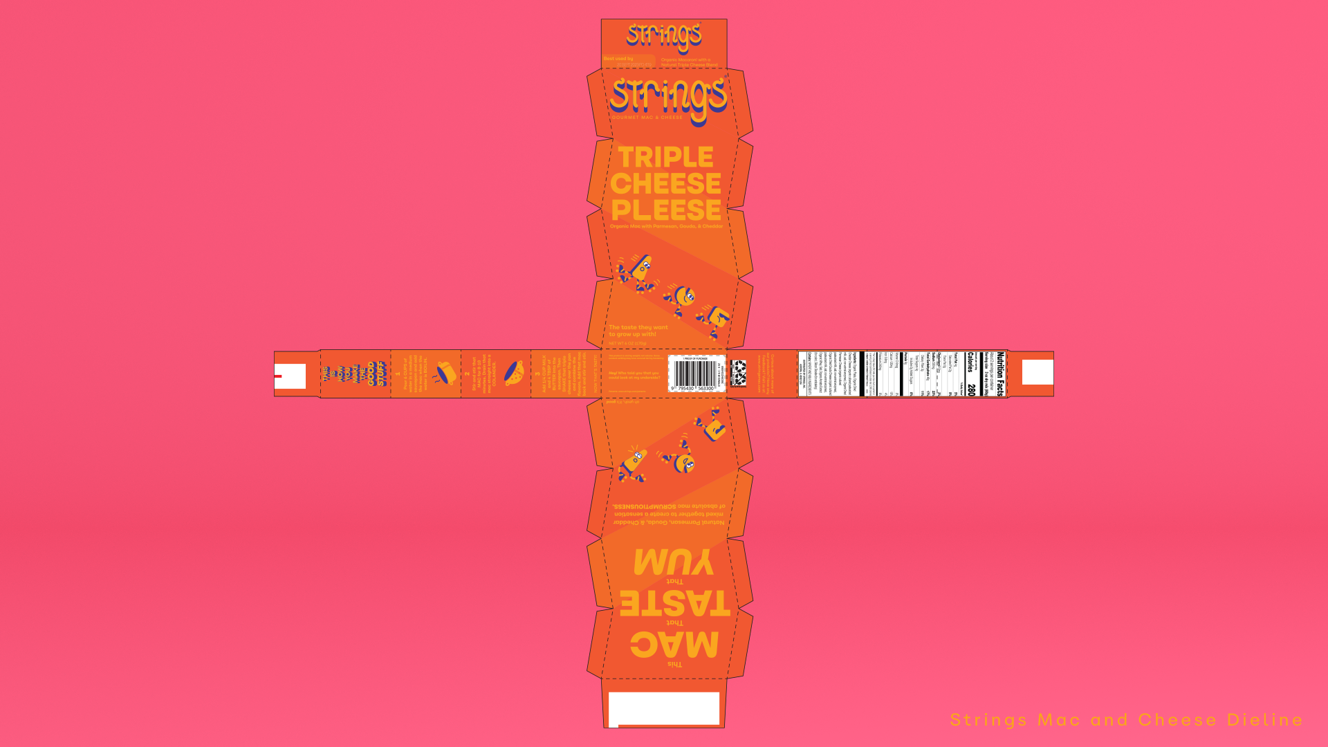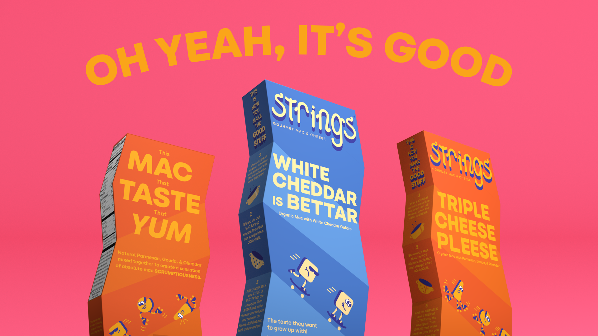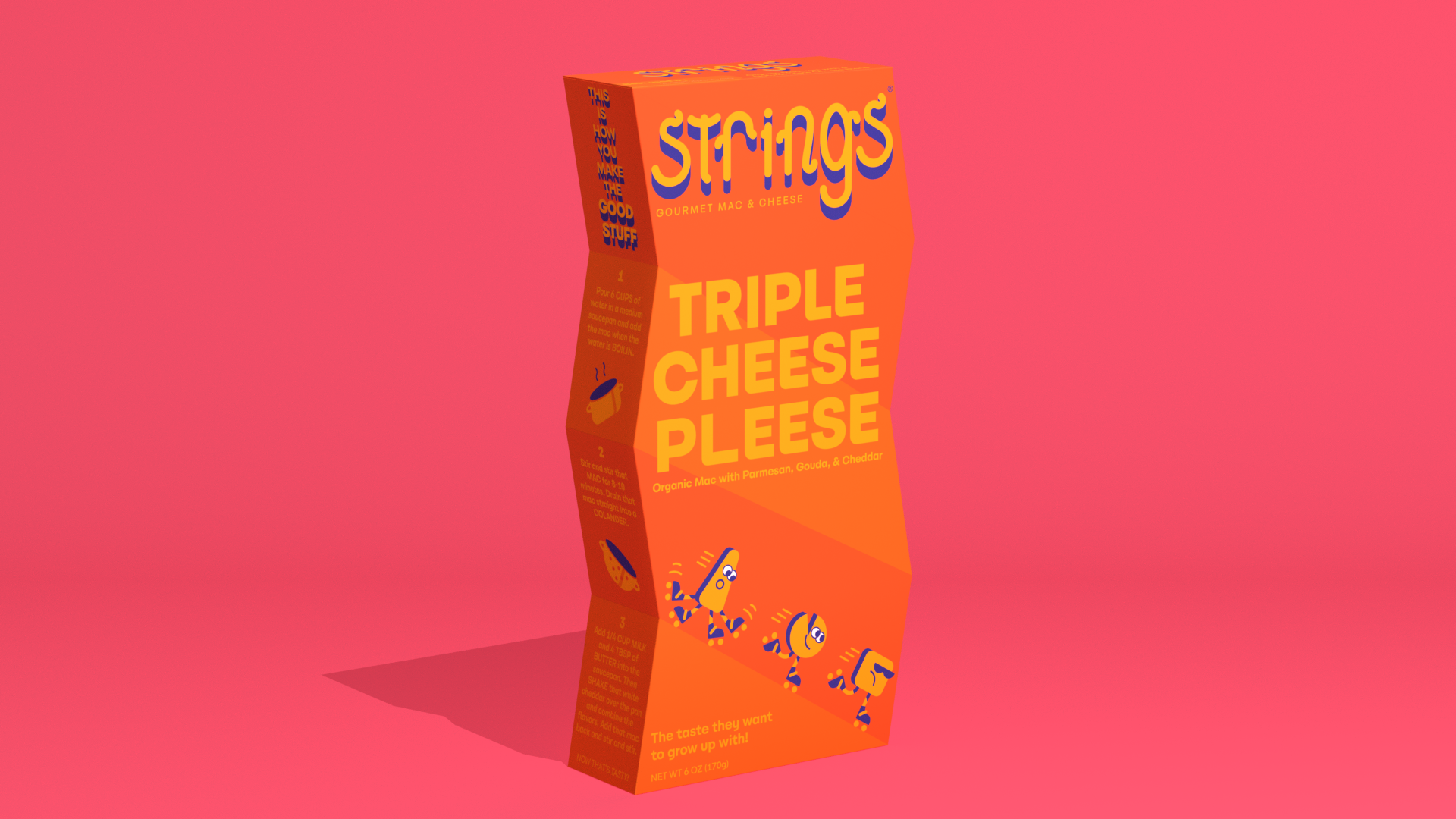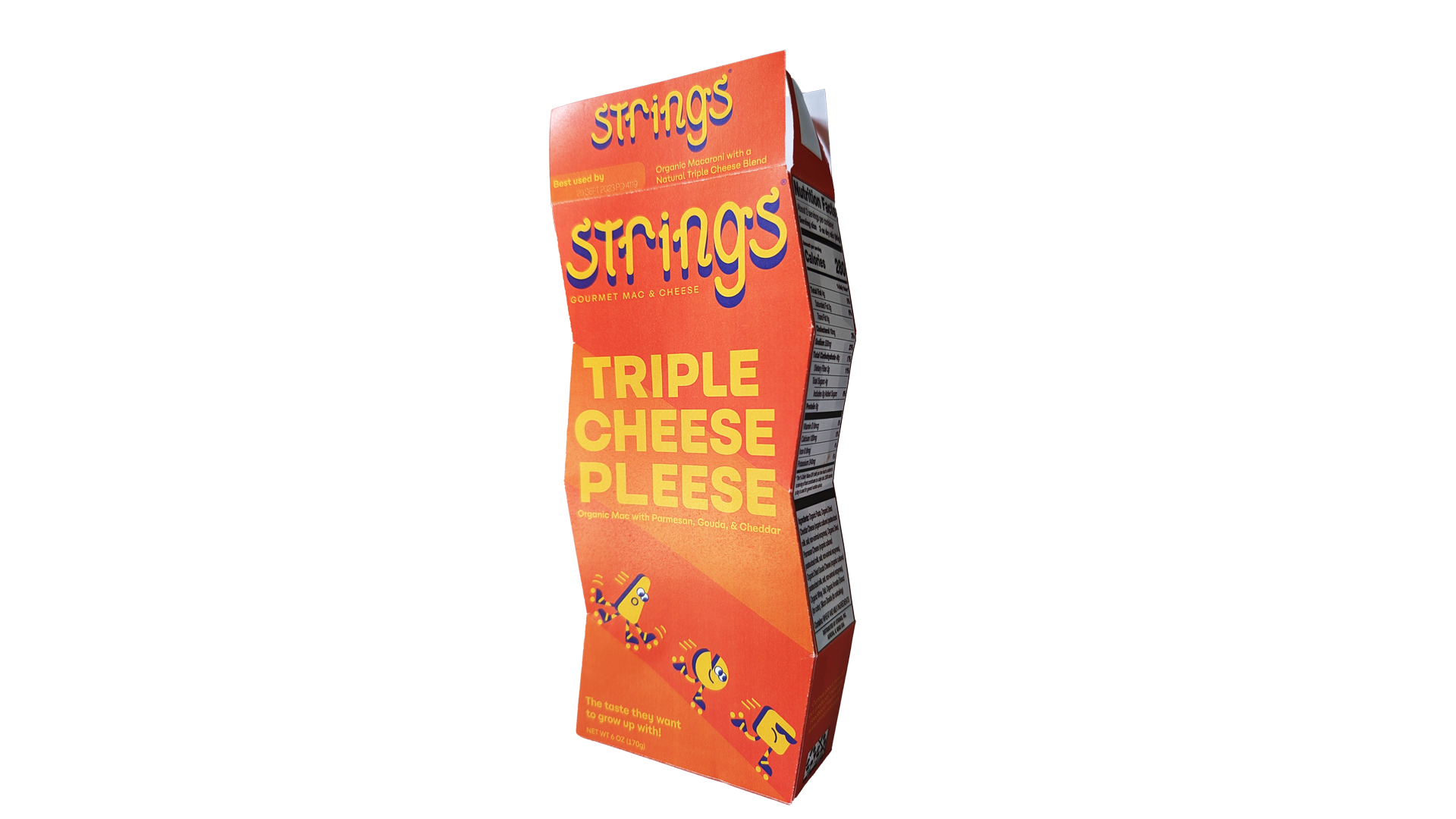 Strings, the gourmet boxed mac and cheese, immediately struts its stuff on the shelf with its unique box shape, playful imagery and colorful design. Strings is not your ordinary boxed mac, or even ordinary box, but ensures it packs a punch in its natural cheese flavor.