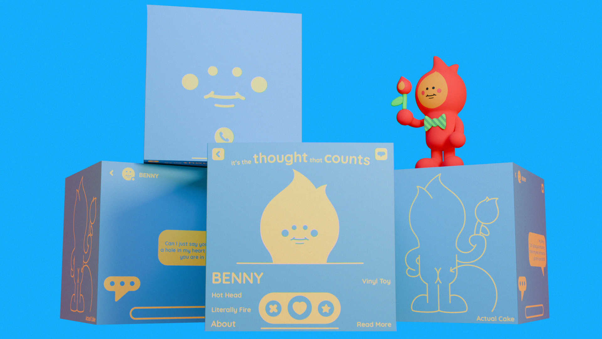 This project was an exploration into the overall motif of “it’s the thought that counts”, relying more on a humorous touch to show off those who are benevolently trying but do not quite reach 100 percent in the end. It follows our character, Benny, an art toy, who, as a sentient flame, tries to woo you over with a gift of a flower, unaware of the fate of the flower. This project also served to act as my first introduction to 3D design. The assignment for the class was a freeform assignment, in which the student could explore a new topic and learn it themselves. I chose 3D, and after some attempts, came to this version of Benny for a finalized 3D render of an art toy.